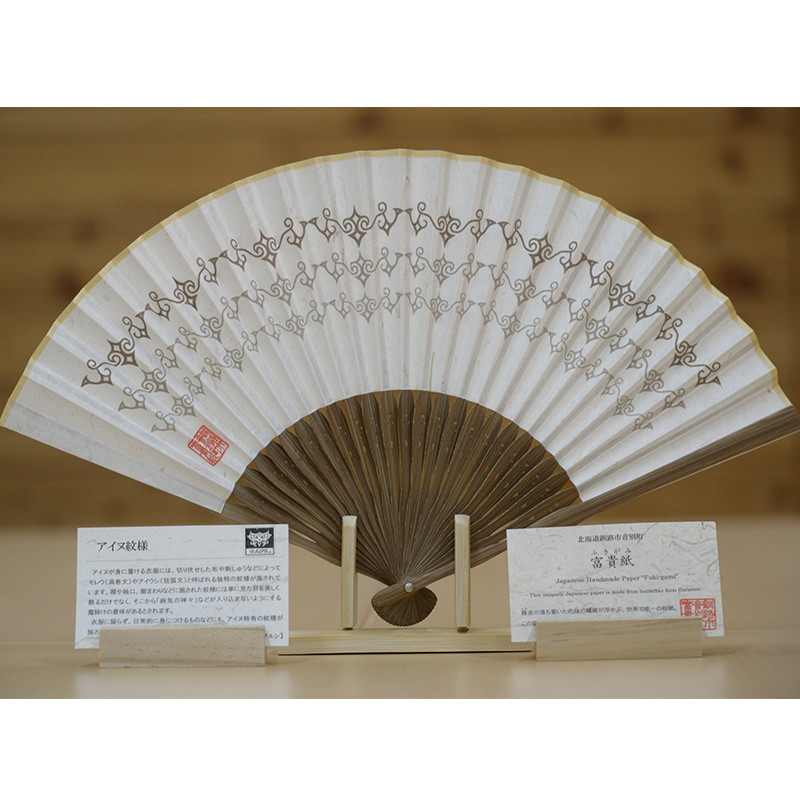 音別地域の特産品である蕗(ふき)の皮を原料とした和紙「富貴紙(ふきがみ)」にアイヌ文様が施された扇子です。