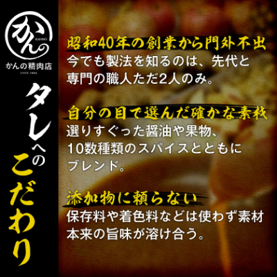 今でも製法を知るのは、先代と専門の職人ただ2人という秘伝のタレは、看板と同じ重みを持つ、かんの精肉店の象徴です。