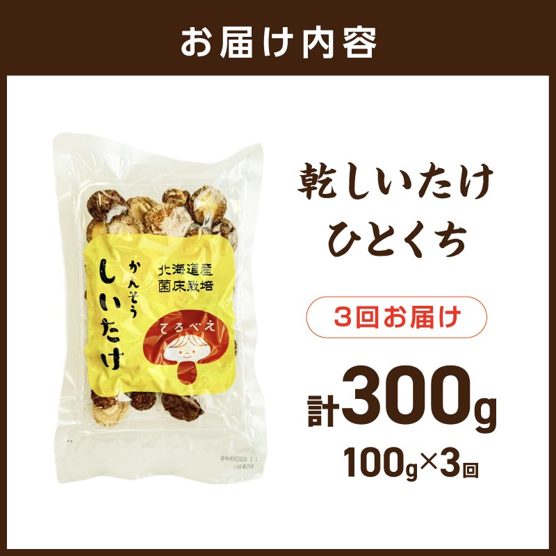 様々な料理に大活躍間違いなし! 【3ヶ月定期便】北海道産 菌床栽培 乾燥椎茸 丸干し 100g ( 野菜 きのこ キノコ 椎茸 しいたけ シイタケ 乾物 定期便 一口サイズ 煮物 お吸い物 炊き込みご飯 出汁 )【999-0257】