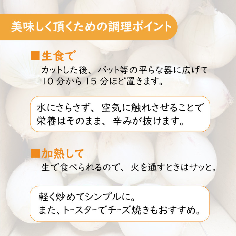 北海道のスーパーで白い玉ねぎを見かけ ふるさと納税での取り扱いがないかと探したところ こちらの商品をみつけました。 段ボールから素敵なデザインで 開けると真っ白で美しい白い玉ねぎ 少し小ぶりなサイズも 愛らしく使い勝手が良いです。 生でシャキシャキと苦みも無く美味しいです。 肉詰めにして加熱しても上品な甘さでジューシーでした。 我が家の毎年のお楽しみに加わりました