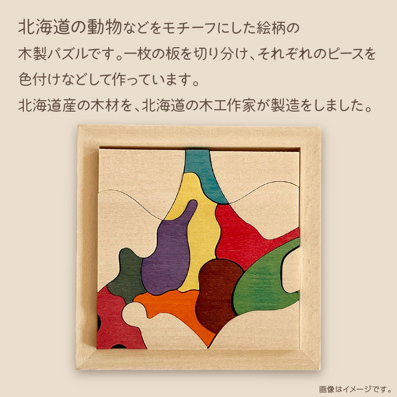 北海道の動物などをモチーフにした絵柄の木製パズルです。