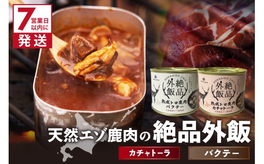 グツグツさせてお召し上がりください♪ 【北海道産】熟成エゾ鹿肉の缶詰「バクテー・カチャトーラ」4缶セット ( エゾ鹿 エゾシカ 肉 熟成 缶詰 北海道 ジビエ キャンプ アウトドア )【125-0040】