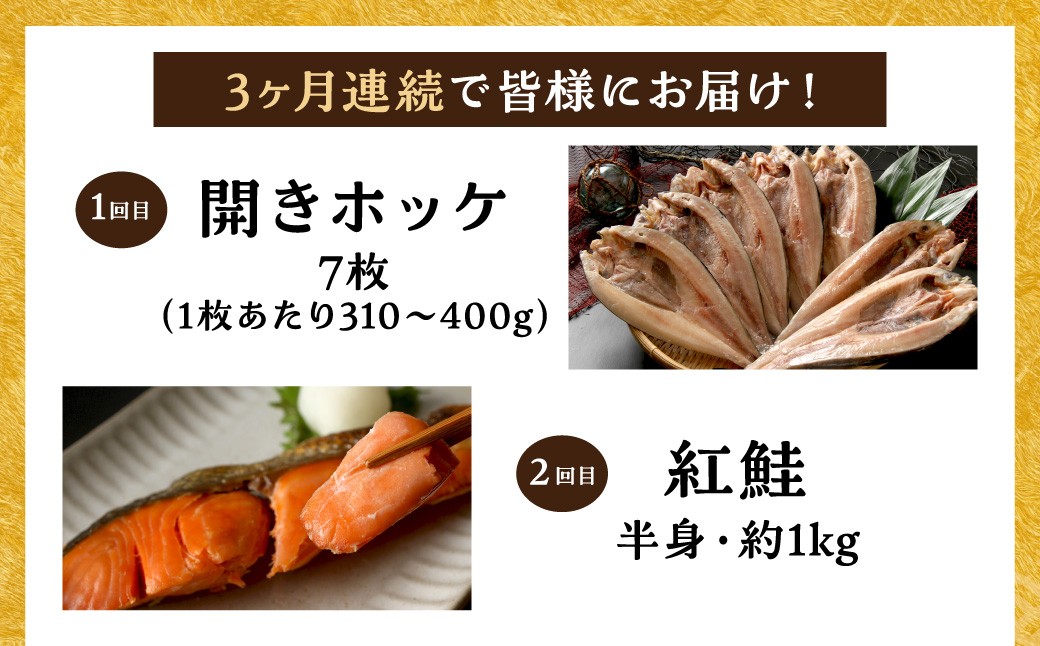 磯の香りと共に皆様の食卓に笑顔を。 【3ヶ月定期便】 海物語~北見からの贈り物~ ( 海鮮 海の幸 定期便 ホッケ カニ さけ しゃけ 紅鮭 蟹 かに ほっけ 魚 逸品 )【999-0204】