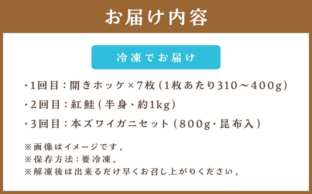 | 容量 | 【1回目】 開きホッケ×7枚(310~400g) 【2回目】 紅鮭(半身・約1kg) 【3回目】 本ズワイガニセット(800g・昆布入) |
