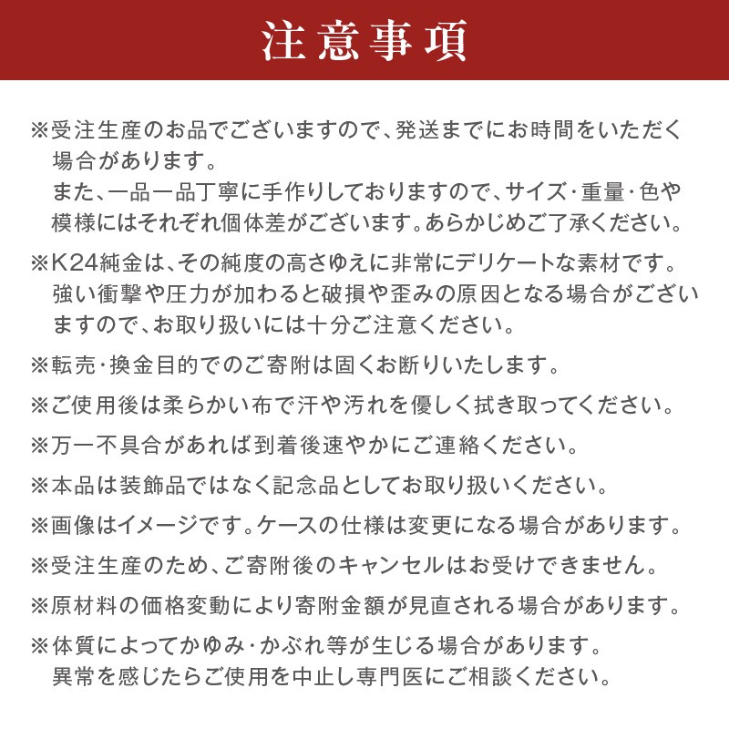 | 容量 | 【サイズ】 ・長さ:約12.5cm ・縦:約0.5cm ・横:約0.5cm ※上記は箸1本分のサイズとなります。 ・重さ:約72g ※上記は箸2本分(1膳)の重さとなります。 (手作りのため、サイズ・重量に個体差が生じる可能性がございます。あらかじめご了承ください。) 【同梱の付属品】 ・検査証付 ※鑑定書・鑑別書の形式ではございません。 【ラッピング対応】 ・ラッピング対応はいたしかねます。 【刻印】 「K24」 ※受注生産のお品でございますので、発送までにお時間をいただく場合があります。 また、一品一品丁寧に手作りしておりますので、サイズ・重量・色や模様にはそれぞれ個体差がございます。あらかじめご了承ください。 ※K24純金は、その純度の高さゆえに非常にデリケートな素材です。 強い衝撃や圧力が加わると破損や歪みの原因となる場合がございますので、お取り扱いには十分ご注意ください。 ※転売・換金目的でのご寄附は固くお断りいたします。 ※ご使用後は柔らかい布で汗や汚れを優しく拭き取ってください。 ※万一不具合があれば到着後速やかにご連絡ください。 ※本品は装飾品ではなく記念品としてお取り扱いください。 ※画像はイメージです。ケースの仕様は変更になる場合があります。 ※受注生産のため、ご寄附後のキャンセルはお受けできません。 ※原材料の価格変動により寄附金額が見直される場合があります。 ※体質によってかゆみ・かぶれ等が生じる場合があります。異常を感じたらご使用を中止し専門医にご相談ください。 |