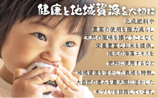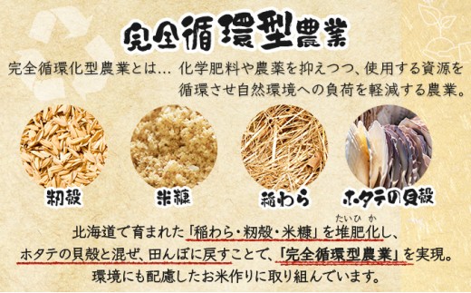 北海道で育まれた「籾殻」「米糠」「稲わら」を推肥化し、「ホタテの貝殻」と混ぜ、田んぼに戻すことで、「完全循環型農業」を実現。環境にも配慮したお米作りに取り組んでいます。