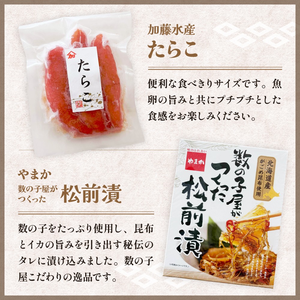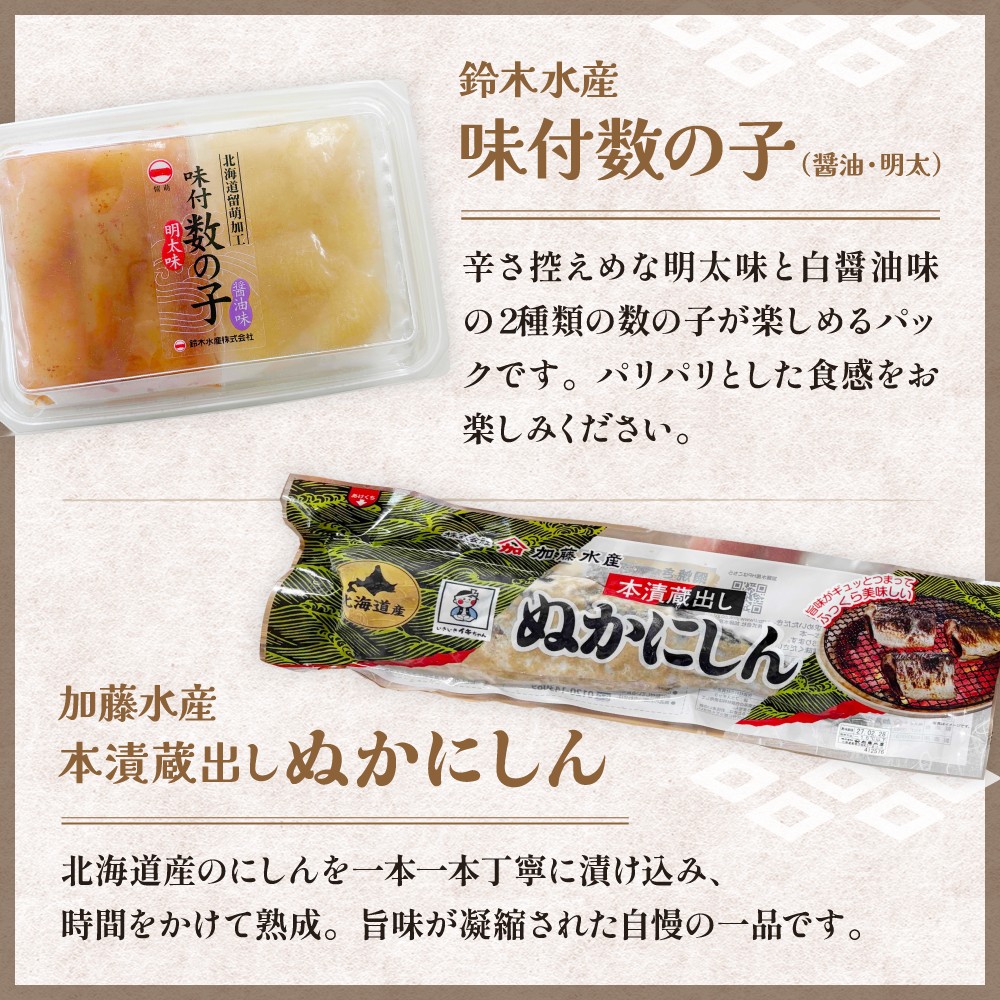 味付数の子やたらこ、松前漬など、北海道ならではの海の味覚に加え、豚ジスカンやハンバーグといった食べ応えのあるおかずもセットに。ご飯のお供から主菜まで、このセットひとつで食卓がしっかり整います。
