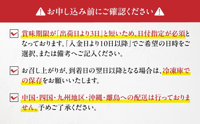 ※賞味期限が「出荷日より3日」と短いため、日付指定が必須となっております。「入金日より10日以降」でご希望の日時をご選択、または備考へご記入ください。