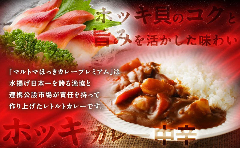 「マルトマほっきカレープレミアム」は水揚げ日本一を誇る漁協と連携公設市場が責任を持って作り上げたレトルトカレーです。