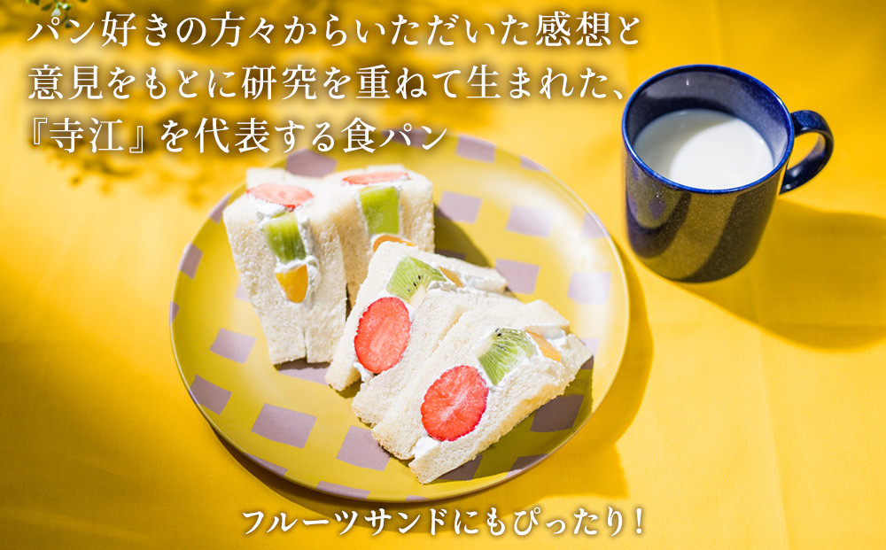 超強力秋播小麦「ゆめちから」の「しなやかで力強い食感」に、春播小麦の「澄んだ香りと濃厚な甘み」を加えたブレンド小麦「ゆめちからRevolution」を使用し、パン好きの方々からいただいた感想と意見をもとに研究を重ねて生まれた、『寺江』を代表する食パンです。ぜひ、「厚切り」にして味わってください。