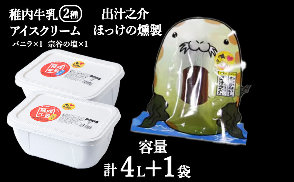 稚内牛乳のアイスクリーム&ホッケの燻製スティック…稚内オリジナル商品「甘いもの」と「しょっぱいもの」を大容量セットでお届け。