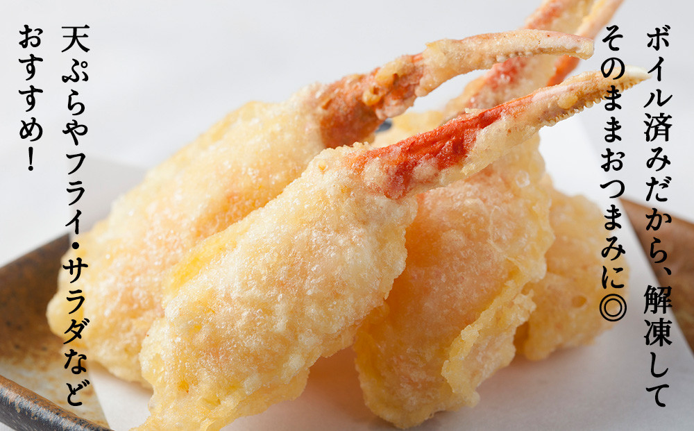 稚内産紅ズワイガニの「爪」1kg。茹でた後、殻に割れ目を入れているので、自然解凍後、手軽にお召し上がりいただけます。天ぷらやフライ、お鍋など、お好みの調理法でお楽しみください。