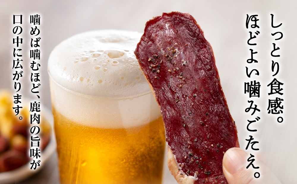 お酒のおつまみやおやつにぴったり!自然の恵みを活かしたこだわりのエゾシカジャーキー。厳選された稚内産エゾ鹿モモ肉を使用し、鹿肉本来の風味豊かな味わいに仕上げました。