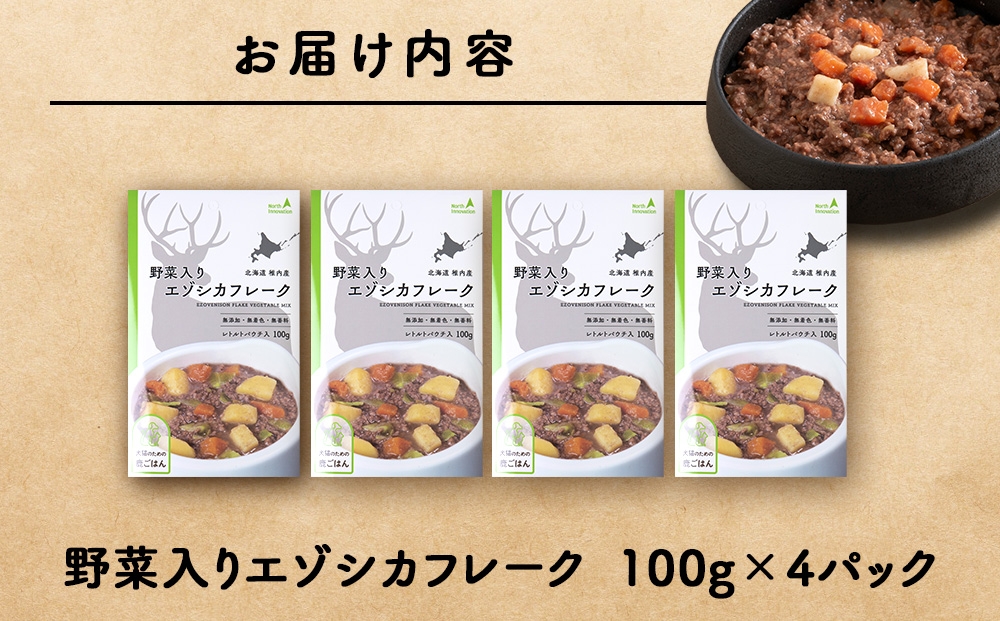 野菜入りエゾシカフレーク100g【鹿ごはんシリーズ】 4パック エゾシカ エゾ鹿 鹿肉 ペットフード 犬のおやつ 犬のごはん 無添加 狩人の匠