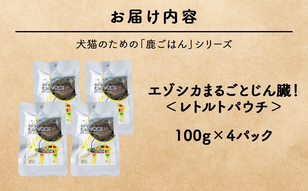 まるごとじん臓 4パック 【鹿ごはんまるごとシリーズ】エゾシカ エゾ鹿 鹿肉 ペットフード 犬のおやつ 犬のごはん 無添加 狩人の匠