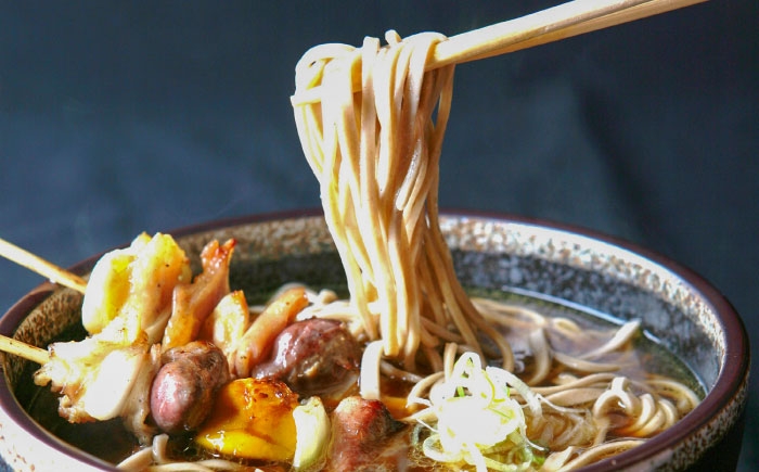 炭火で焼き上げた芳ばしい「もつ串」を、温かい鶏だしそばに入れて食べるのが美唄流の楽しみ方。