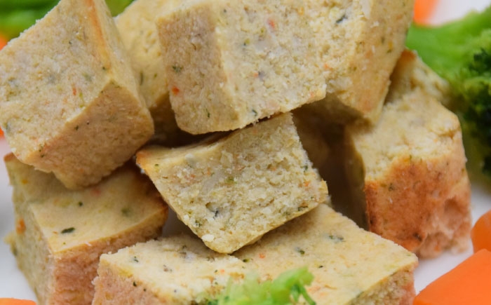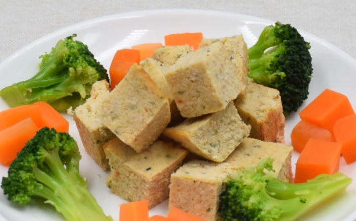 こちらのフィッシュローフには、おからやブロッコリー、ニンジンなどの野菜をバランスよく配合しています。