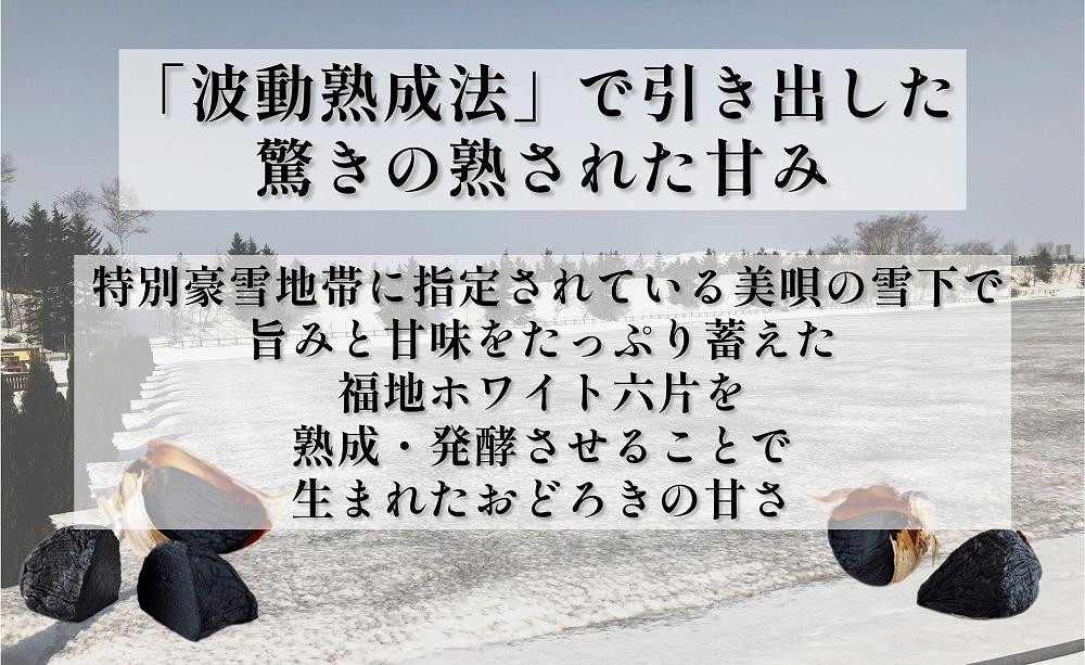 特別豪雪地帯に指定されている美唄の雪下で、旨みと甘みをたっぷり蓄えた福地ホワイト6片を「波動熟成法(※)」で時間を掛けて、じっくり熟成・発酵させることで、にんにく特有のニオイや刺激がほとんど気にならない、ドライフルーツ感覚で食べられる「黒にんにく」に仕上げました。