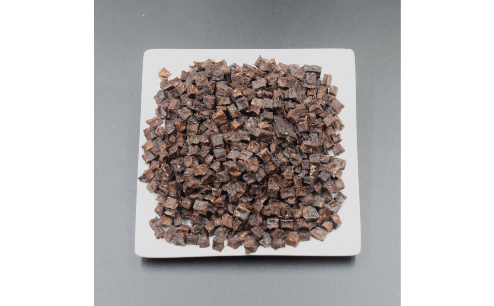 北海道の空知で捕獲した蝦、夷鹿肉をミンチ状にしてからキューブ状にカットして乾燥させてます。