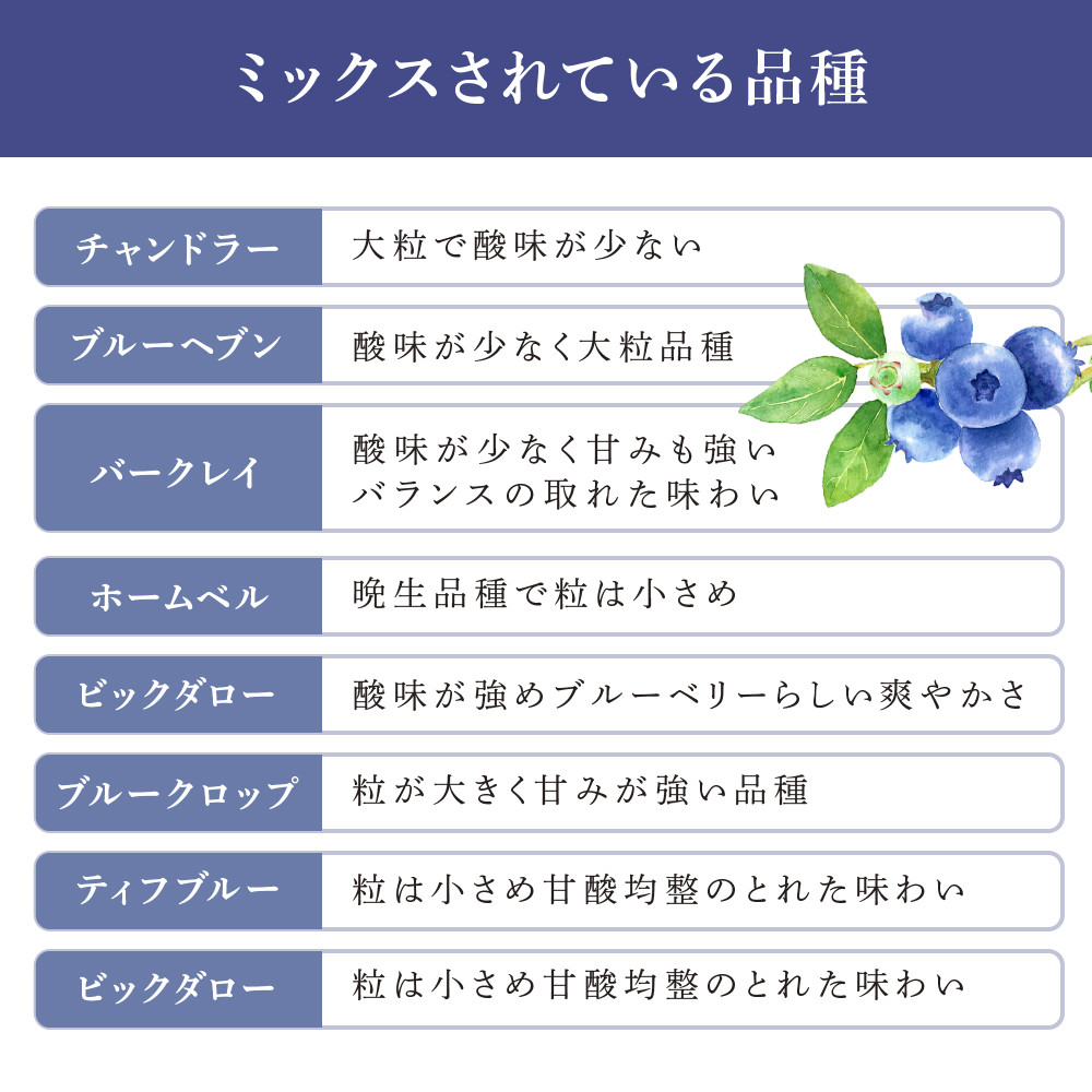 いろいろな品種の入ったミックスブルーベリーをお送りさせていただきます。