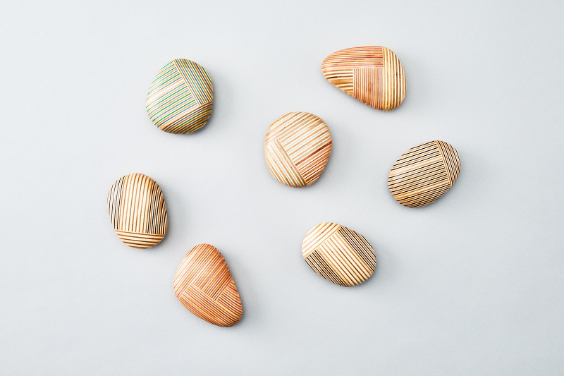 ペーパーウッドという北海道産木材とカラフルな再生紙を積み重ねた美しい合板をパッチワークのように繋ぎ合わせた、小石のようなペーパーウェイトです。