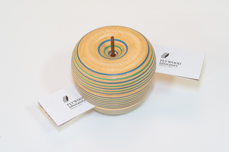 ペーパーウッドという北海道産木材とカラフルな再生紙を積み重ねた美しい合板の断面を活かしたリンゴの形のカードホルダー。