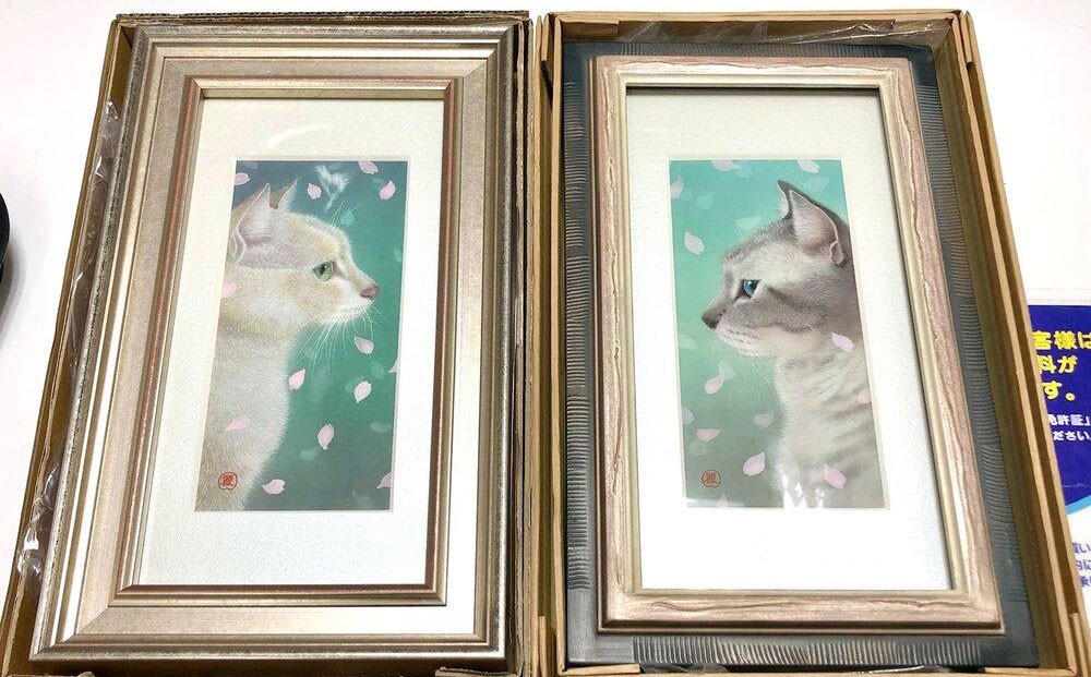 江別市出身・江別市在住の谷地元麗子による猫の描写は、まるで生きているかのような繊細な毛並みで、丁寧な毛描きを心がけて描いています。柔らかさを表現するにあたり、絹本彩色による日本画の伝統的技法で描いています。日本画は 絵絹や和紙、水干や岩絵具などといった伝統的な画材を用いて描かれていますが、様々な金属箔なども使用した工芸的要素もあり、奥深い表現になっています。