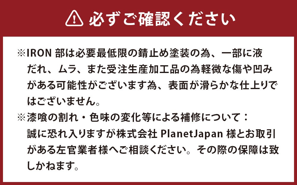 ※IRON部は必要最低限の錆止め塗装の為、一部に液だれ、ムラ、また受注生産加工品の為軽微な傷や凹みがある可能性がございます為、表面が滑らかな仕上りではございません。