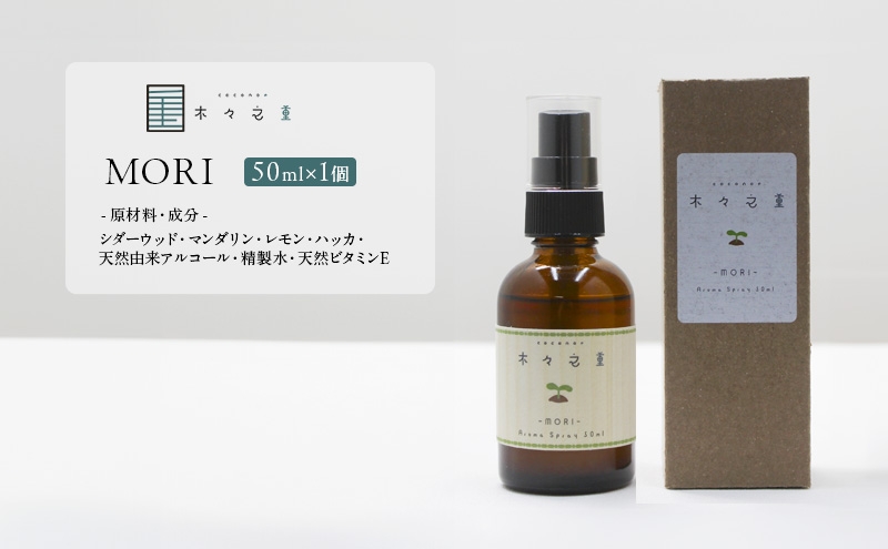 木々之重 アロマスプレー MORI 50ml アロマ アロマグッズ 香り 精油 シダーウッド マンダリン レモン ハッカ 清涼感 果物 爽快感 さっぱり リセット 癒し 贈答 プレゼント ご褒美