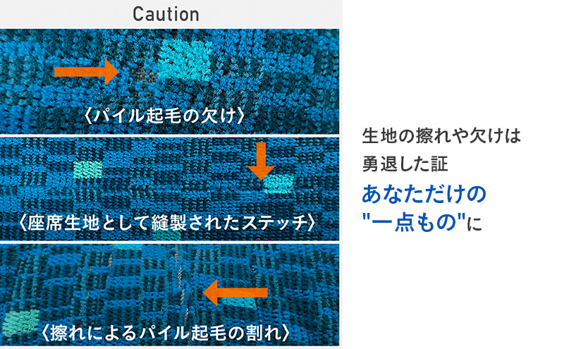 実際に東海道新幹線N700系typeAで使われていたモケット生地を採用。廃棄されるはずだった生地を洗浄後、再利用できる部分を選び、国内で丁寧に縫製しています。