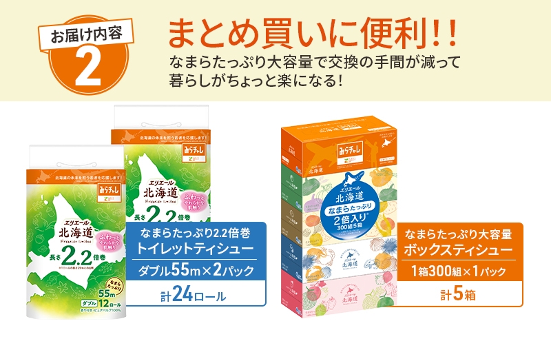 □買い置き用のエリエール「北海道ティシューなまらたっぷり300組5箱×1パックと北海道トイレット ダブル なまらたっぷり2.2倍巻12ロール×2パック/計24ロール」