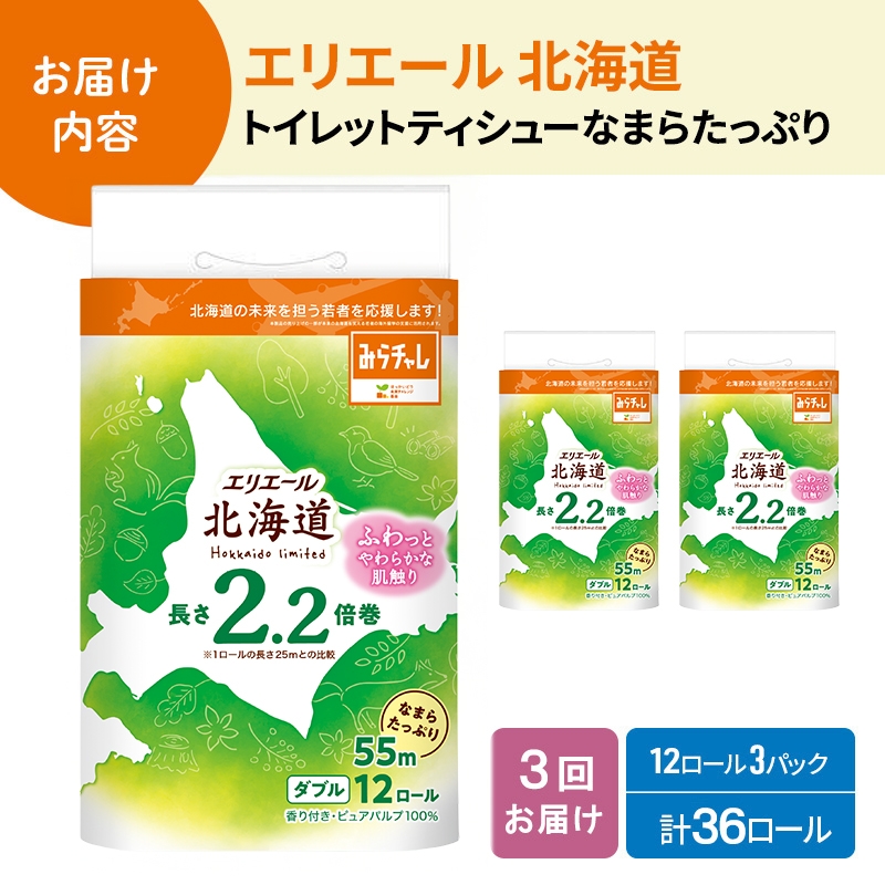 | 容量 | エリエール 北海道トイレット ダブルなまらたっぷり2.2倍巻 12ロール×3パック/計36ロールを3ヵ月連続でお届け |