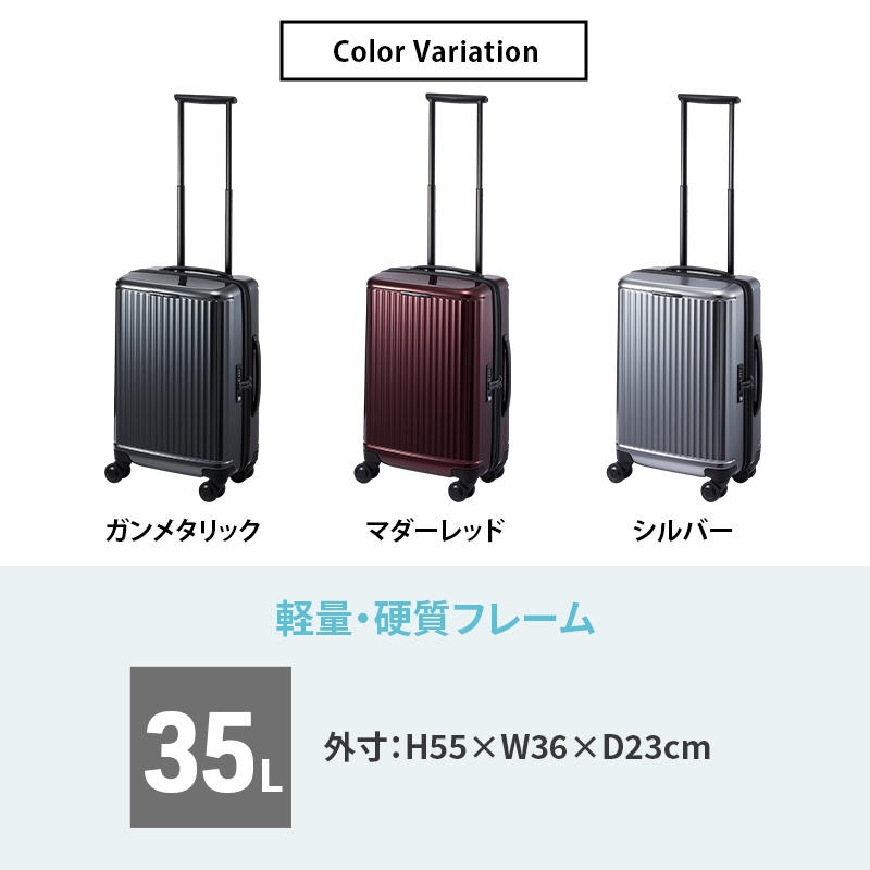 | 容量 | ブランド:PROTECA カラー:11 銀鉄/シルバー サイズ:H55×W36×D23cm ※サイズはキャスター・ハンドルを含む外寸表記です。 容量:35L 重量:3.6kg 素材:ポリカーボネートABS混合樹脂 生産国:日本 機能一覧:4輪/双輪キャスター/TSダイヤルロック/サイレントキャスター(R)/ベアロンホイール(R)/MAGIC STOP(キャスターストッパー)/国内100席以上・国際機内持込み |