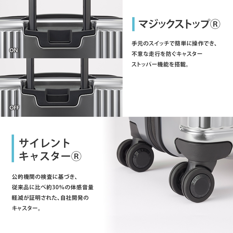 | 容量 | ブランド:PROTECA カラー:02 砲金色/ガンメタリック サイズ:H61×W43×D26cm ※サイズはキャスター・ハンドルを含む外寸表記です。 容量:56L 重量:4.2kg 素材:ポリカーボネートABS混合樹脂 生産国:日本 機能一覧:4輪/双輪キャスター/TSダイヤルロック/サイレントキャスター(R)/ベアロンホイール(R)/MAGIC STOP(キャスターストッパー) |
