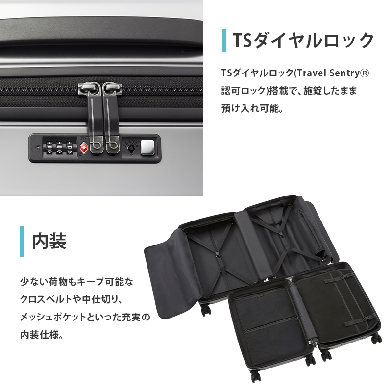 TSダイヤルロック(Travel Sentry(R)認可ロック)搭載で、施錠したまま預け入れ可能。