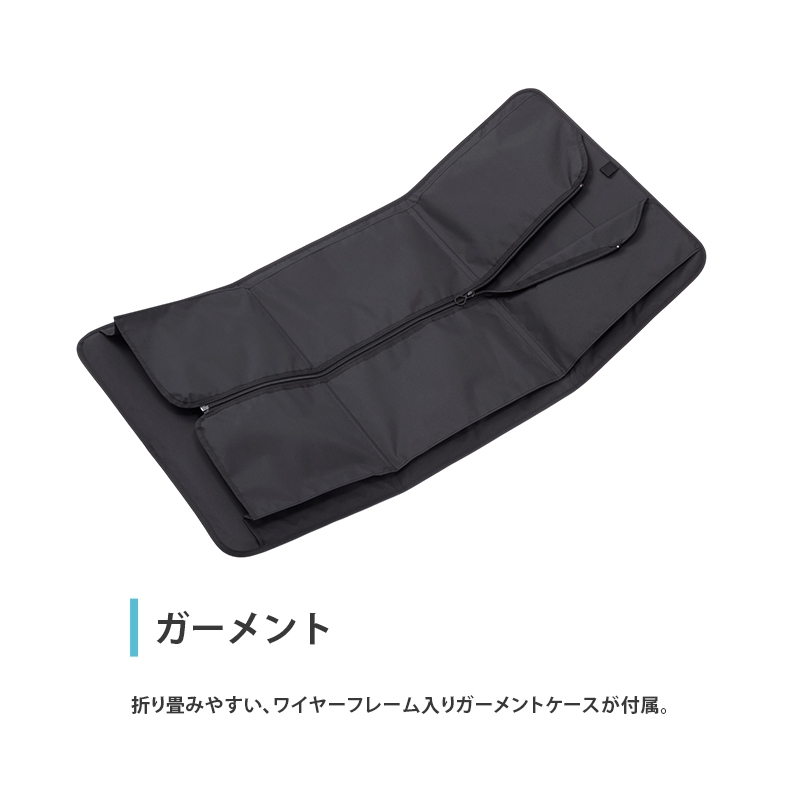 折り畳みやすい、ワイヤーフレーム入りガーメントケースが付属。