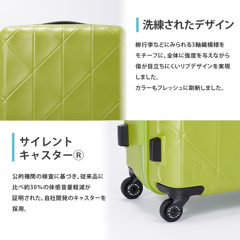 | 容量 | ブランド:PROTECA カラー:03 コズミックネイビー サイズ:H59×W43×D26cm ※サイズはキャスター・ハンドルを含む外寸表記です。 容量:52L 重量:3.4kg 素材:ポリカーボネート 生産国:日本 機能一覧:4輪/TSダイヤルファスナーロック/キャスターストッパー/サイレントキャスター(R)/ベアロンホイール(R) |