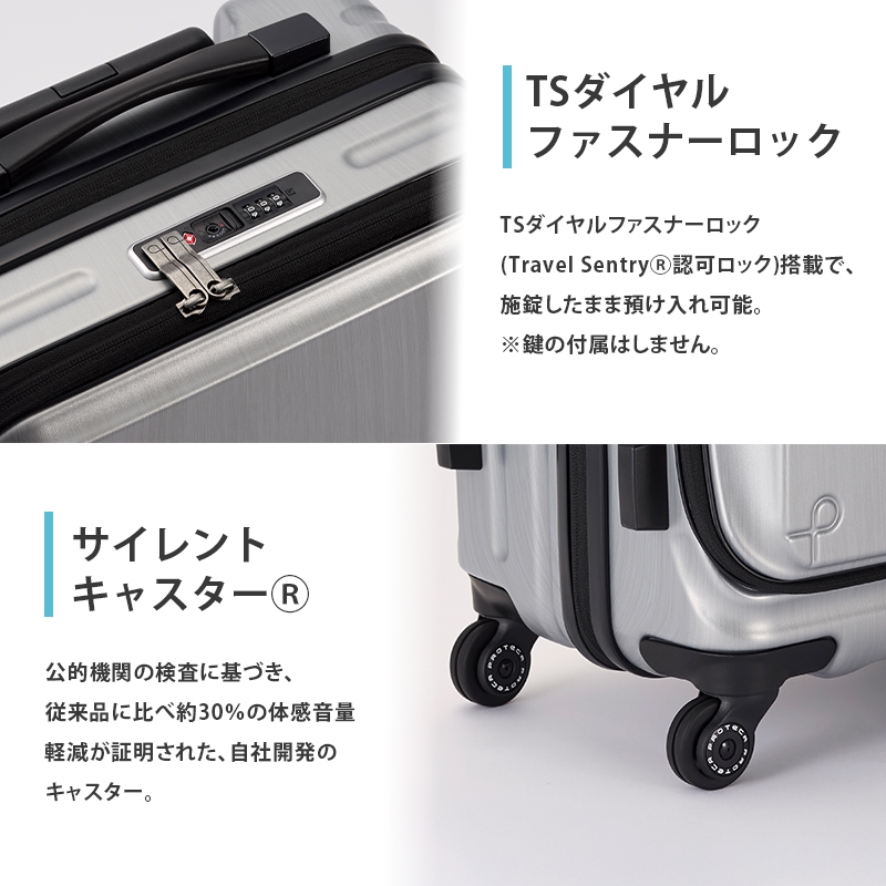 TSダイヤルファスナーロック(Travel Sentry(R)認可ロック)搭載で、施錠したまま預け入れ可能。