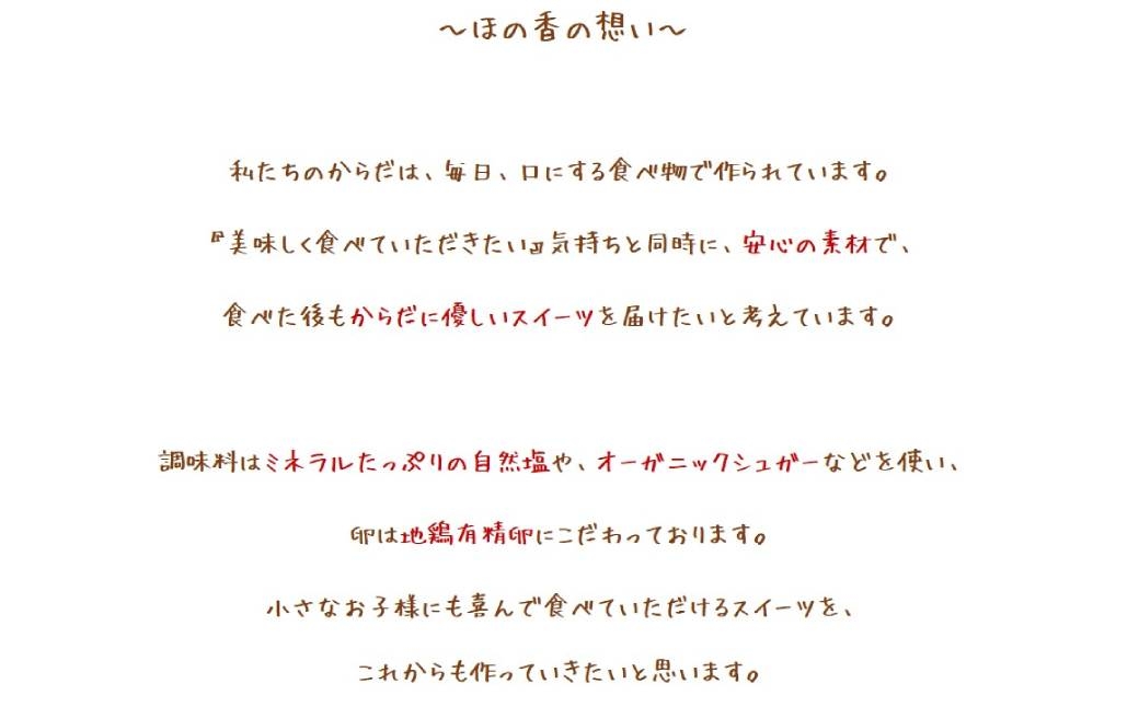 ~Cafe ほの香のまるごとスイーツ定期便はココに注目~ 1ほの香の味覚をまるごとお届け! 「からだに優しいスイーツ」を10ヵ月連続でお届けしますので、毎月違った味をお楽しみいただけます。原材料は大部分を北海道産・オーガニックにこだわって一つ一つ丁寧にお作りしております。是非「Cafe ほの香のお気に入り」を見つけてください☆ 2賞味期限は短め 保存料・着色料などの添加物は一切不使用なので、一般のスイーツと比べると賞味期限は短めです。 【美味しくお召し上がりいただくために…】 全て冷凍状態でお届けいたします。解凍は冷蔵庫で4時間以上かけて行ってください。 解凍後の賞味期限は、要冷蔵で2日以内が目安です。 1オホーツクバスクチーズケーキ 珈琲はもちろん、ビールやワイン等のおつまみとしても大好評。自然塩を同梱。 2オレンジ&アールグレイパウンドケーキ オーガニックアールグレイの茶葉とオレンジピールを贅沢に練り込んだ、爽やかな香りのオリジナルケーキ。 3レモンシトロンムースタルト レモン1個をまるごとしぼった果汁と大自然で収穫された天然ハチミツを贅沢に使い、爽やかな口あたりが人気。 4レアチーズタルト レモン果汁をアクセントに、ノーブルな味わい。タルト生地に興部町の発酵バターを使用。 5しっとりショコラ オーガニッククーベルチュールチョコレートとココアを使用し、洋酒を効かせ、低温でしっとり焼き上げた大人のチョコレートケーキ。 6ベイクドチーズケーキ ほんのりとレモン香るCafe ほの香で最も歴史の長い定番ケーキ。 7レモンシトロンパウンドケーキ レモン1個をまるごとしぼった果汁がたっぷり入った、女性に人気のケーキ。レモンアイシングソースが甘みと酸味を引き立てる。 8淡雪スフレ スフレチーズケーキは、スプーンを入れるとシュワッと軽やかで、口のなかで溶けて行くような食感。半解凍でアイス感覚。 9ニューヨークチーズケーキ 塩味の効いたアーモンド風味のタルト生地と、濃厚で滑らかなチーズ生地の絶妙なバランスをお楽しみいただきたい、リッチなケーキ。 10ラズベリームースタルト たっぷりのラズベリーとオーガニックシュガーを使った甘酸っぱいケーキ。手作りラズベリーソースを同梱。 ※画像はイメージです。