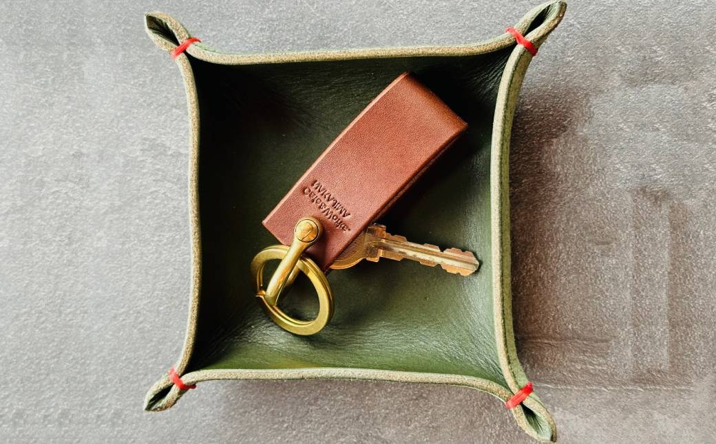 こちらのレザートレーは、高品質の国産革を使用し、耐久性と発色の美しさが特徴です。 トレーの四隅には赤いステッチがアクセントとなっています。 鍵やアクセサリー、時計などの日常使いの小物を収納でき、インテリアにもなじむ落ち着いたモスグリーンが特徴です。 玄関やデスク、寝室など様々な場所で活躍できます。また、贈り物としても喜ばれている品です。 ※画像はイメージです。
