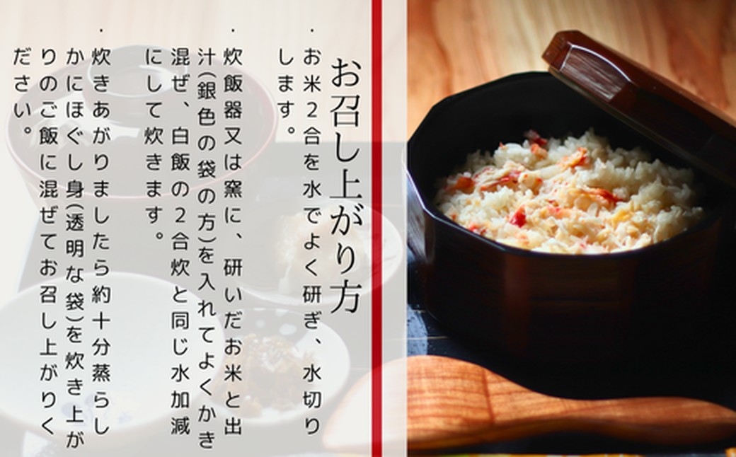 炊き上げ用の出汁とたらばがにの身を別々にパッケージしておりますので、炊きあがったご飯に混ぜ込むもよし、ご飯にのせて楽しむもよし。お好みの食べ方でお召し上がり下さい。