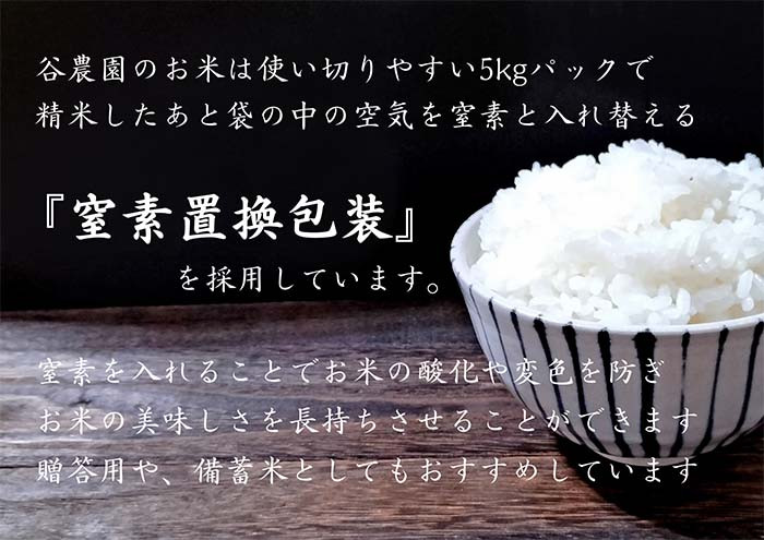 「産直の谷農園」の産地直送米は、お届けしてから最後まで美味しくお召し上がり頂くため、米袋中の空気を抜き、窒素ガス(不活性ガス)に入れ替えています。