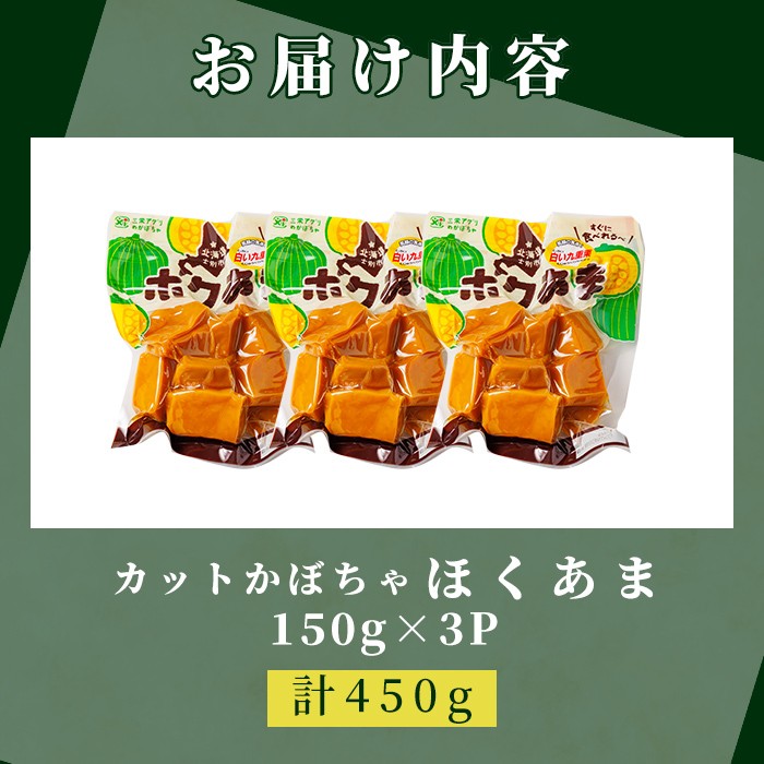 時短調理の味方、加熱済みかぼちゃ! 【A7121】北海道士別市産!カットかぼちゃ ほくあま(150g×3個) レトルト 小分け 常温 加熱加工 かぼちゃ カボチャ 南瓜 皮つき カット野菜 時短 簡単 野菜 やさい サラダ 煮物 お弁当 【三栄アグリ】