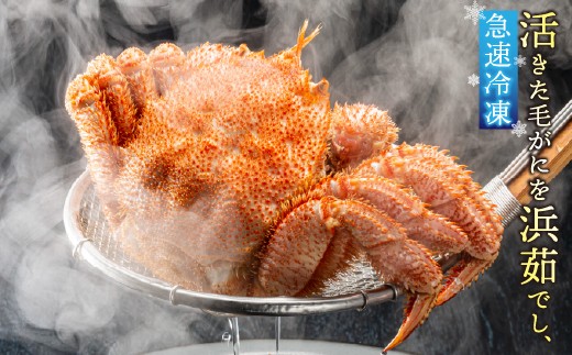 活きた毛がにを浜茹でし、急速冷凍しました。根室の海の幸を是非ご賞味下さい。