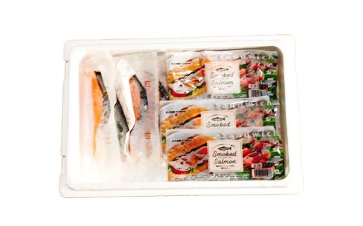 脂の乗ったサーモントラウトを使用したスモークサーモンと塩銀鮭切身セットです。