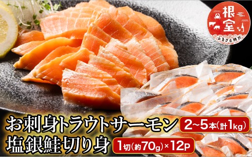 B-09094 お刺身トラウトサーモン2~5本(計1kg)&塩銀鮭切り身1切(約70g)×12P