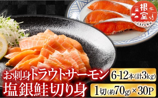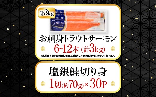 D-09040 お刺身トラウトサーモン6~12本(計3kg)&塩銀鮭切り身1切(約70g)×30P