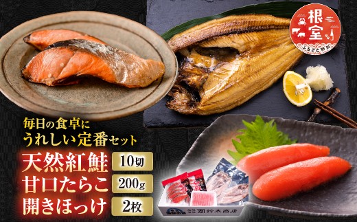 A-14045 天然紅鮭10切、甘口たらこ200g、開きほっけ2枚