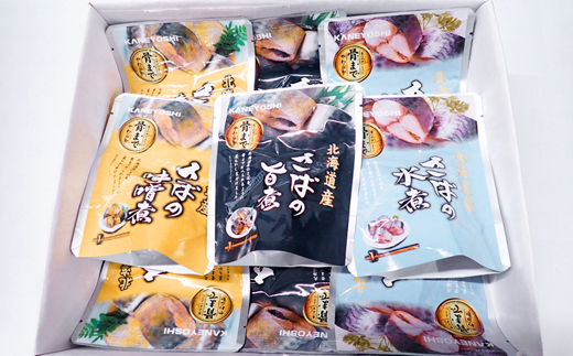 北海道の海で漁獲された鮮度の良いサバを原料に独自の調味料で味付けし骨まで食べられるようじっくり煮込みました。定番の3種類の味付けをお楽しみください。常温保管OKなので保存に便利です。
