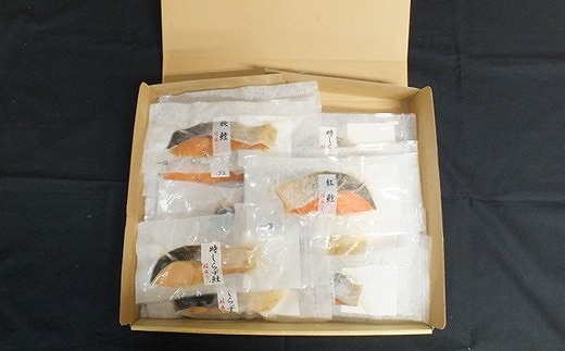 秋鮭、紅鮭、時しらず鮭の切身を焼き加工した後にパック包装してお届けします。鮭の食べ比べをお手軽に楽しむことができます。